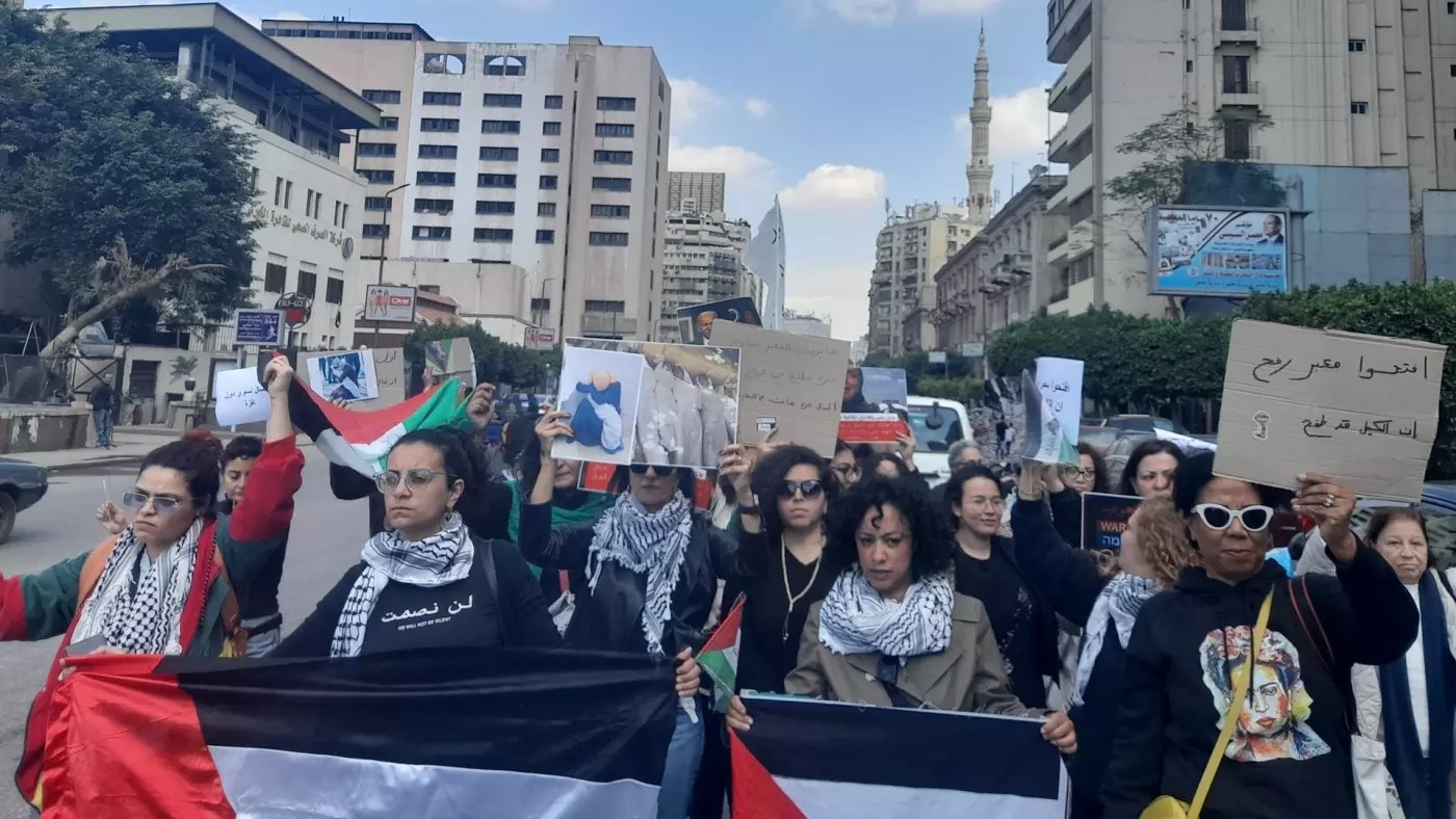 وتجمعت نحو 50 امرأة خارج الاتحاد النسائي الفلسطيني في القاهرة، وسرن في الشوارع، وهتفن تضامنا مع “نساء فلسطين الشجاعات”.