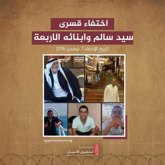 فبحسب شهادات شهود العيان والأسرة فللعام الثامن لازال مصيرهم مجهولا وذلك بعد أن قامت قوة مشتركة من الجيش والشرطة المصرية باعتقال المواطن السيناوى الحاج سيد أحمد سالم وأربعة من أولاده تعسفيا .