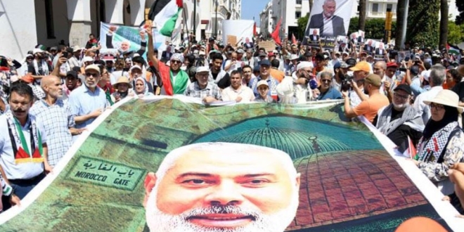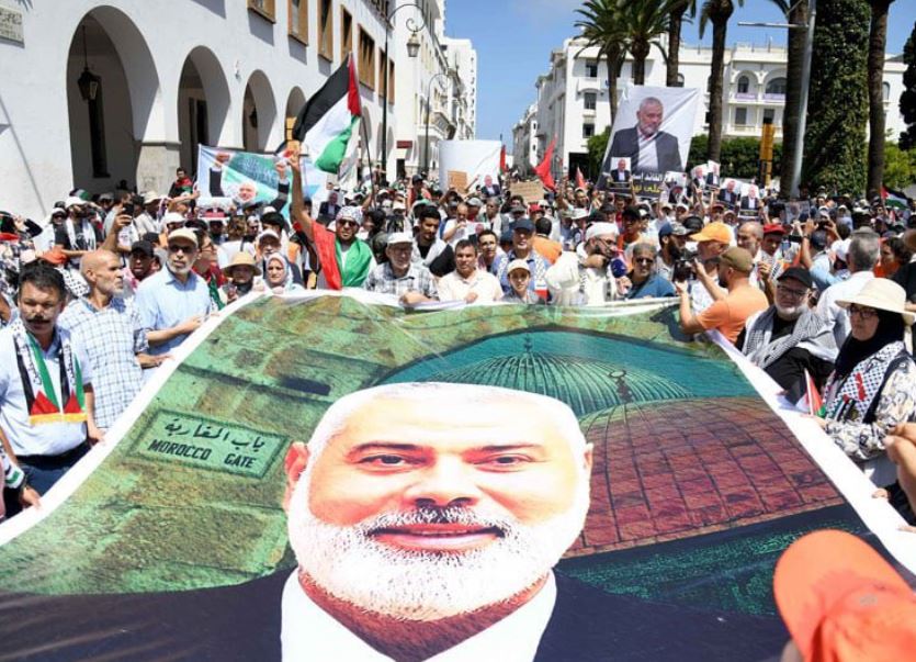 وفي مدن مغربية أدى المغاربة صلاة الغائب على روح الشهيد أبو العبد اسماعيل هنية بالرباط بعد مسيرة بالعاصمة.