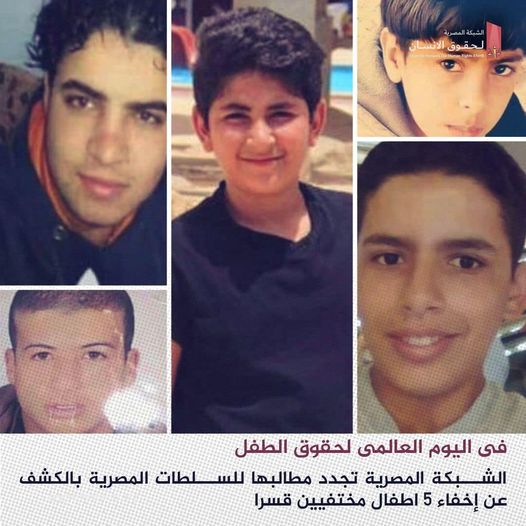طالبت الشبكة المصرية لحقوق الإنسان، سلطات الانقلاب في مصر بالإفصاح عن مكان احتجاز وإخفاء خمسة أطفال، ألقي القبض عليهم قبل سنوات، وذلك بالتزامن مع اليوم العالمي لحقوق الطفل الموافق لـ 20 نوفمبر من كل عام.