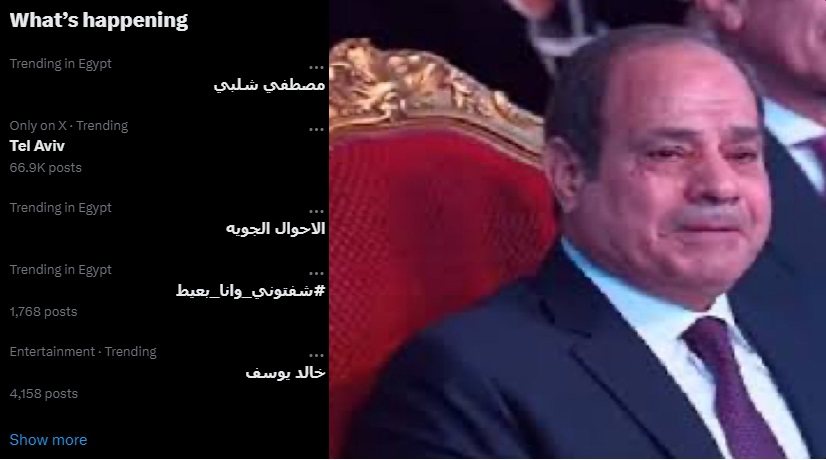 تصدر هاشتاج #شفتوني_وأنا_بعيط منصة التواصل الاجتماعي (إكس) أو “تويتر” سابقا وقال مغردون إن ما يفعله في المصريين ويستمر في صنعه يعني أن دموعه هي دموع النفاق الحاضرة في كل وقت.