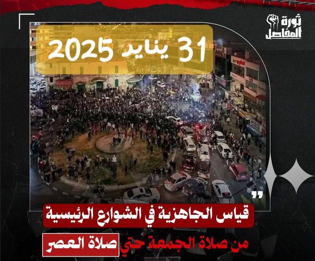 تصدر هشتاجي #ثورة_المفاصل و#قياس_الجاهزية منصات التواصل الاجتماعي حيث دعا الناشطون كل حر للانضمام والمشاركة بدأ من الآن في تكوين #اللجان_الشعبية كما كانت في يناير داعين الجميع في #قياس_الجاهزية الجمعة القادمة للنزول إلى الشارع من بعد صلاة الجمعة إلى صلاة العصر موضحين أنه ستكون هناك مهمة أخرى أخرى سوف تحدد بعد صلاة العصر وبدون أي مظاهر ثورة فقط المطلوب هو حشد المواطنين بالشوارع.