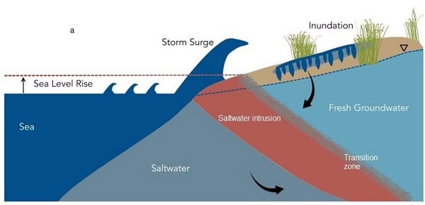 وأضاف أن "ارتفاع منسوب سطح البحر، سوف يؤدي حتما إلى حدوث ما يعرف بعملية (غزو البحار لليابسة Sea intrusion) حيث تتسرب مياه البحر تحت المياه الجوفية والتي هي غالبا ما تكون (مياه المجاري البايظة) وتسبب تشبع للتربة تحت منسوب الأساسات وتخفيضا لما يسمى (الإجهاد الفعّال أي Effective stress)، وهذا يتسبب بشكل عام في تخفيض قيمة قوة تحمل التربة وأيضا حدوث ميول للمباني أو تشرخات للكمرات بين الأعمدة، وكذلك بلاطات السقوف بسبب الهبوط الغير منتظم".