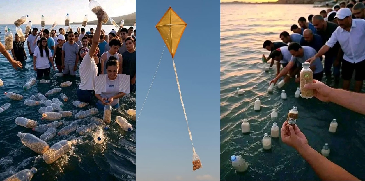 تصدرت مبادرة إلقاء زجاجات معبأة بالحبوب والبقول بعنوان "من البحر إلى البحر" منصات التواصل الاجتماعي في وقت عبّرت فيه المبادرات إلى رمزية عظيمة، أمام إغلاق حكام مصر والعرب الأبواب بوجه إغاثة غزة.