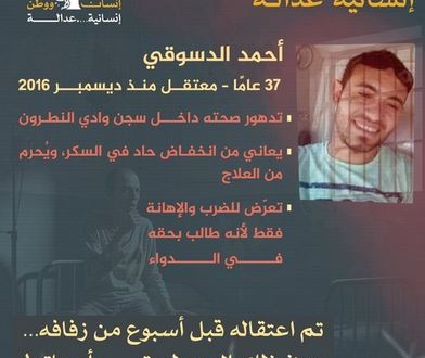 وبعد نحو 8 سنوات خلف القضبان، قالت: إن "أحمد الدسوقي يُصارع تدهورًا صحيًا خطيرًا وأبرز أعراضه انخفاض حاد في نسبة السكر بالدم، يفقده الوعي أحيانًا ويهدد حياته في أي لحظة، ورغم تكرار نداءاته، تصرّ إدارة السجن على حرمانه من العلاج، بل وتُمعن في التنكيل به".