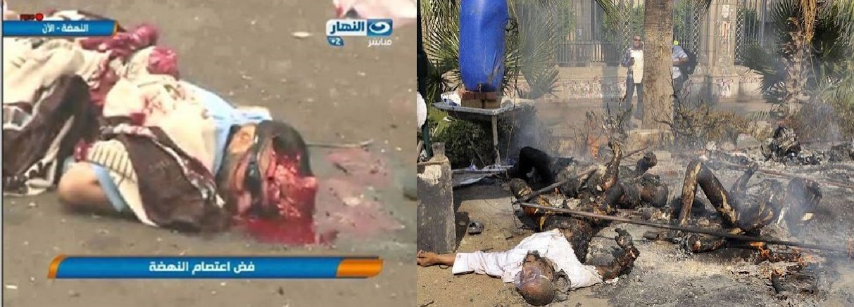 ومع فض ميدان النهضة بالجيزة في 14 أغسطس 2013، في وقت أقل مقارنة بفض ميدان رابعة العدوية، كشفت تقارير أن نحو 40 شخصًا أُحرقوا على أيدي جنود وضباط الشرطة والجيش، وكانت جثثهم مرمية أمام جامعة القاهرة وفي محيط الميدان وحديقة الحيوان المجاورة.
