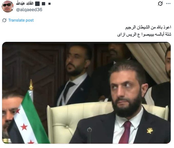 وعليه علق الصحفي نظام المهداوي @NezamMahdawi "ربما لديك مليون نقد على أحمد #الشرع، لكن هؤلاء الأغبياء يدفعونك للاصطفاف معه حين يوجّهون سهامهم وغِلّهم وكرههم وحقدهم للرجل بسبب نظرة قد تكون مقصودة وقد لا تكون.. لا يعرف معيز #السيسي أنهم حين يوجّهون سهامهم ضد شخص، فإنهم يكرمونه ويمنحونه وسام الشرف والنزاهة والوطنية والشجاعة.".