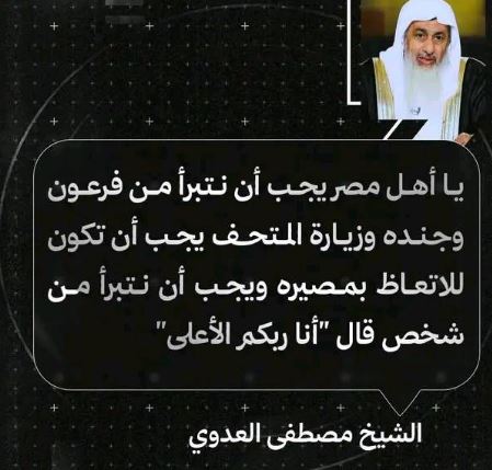 الأكاديمي رضوان جاب الله علق "عبر هاشتاج #لا_يحق_لمصطفى_أن_يذم_فرعون قائلا: "اعتقال الشيخ مصطفى العدوي يضيع كل الاحتفالات والمهرجانات ويبين أنها دعائية ، الرجل قال إنه يتبرأ من فرعون وعمله وزيارة المتحف تكون للعبرة والعظة!".
