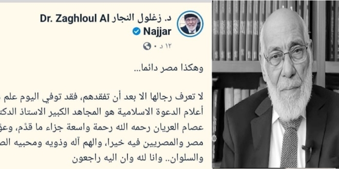 ربما ما يفسر سبب مغادرة رئيس "مركز الإعجاز العلمي" بالمجلس الأعلى للشئون الإسلامية، د. زغلول النجار، 92 عاما، والمتوفي الأحد 9 نوفمبر الجاري، مصر وإقامته في الأردن حتى مماته، ودفنه في عمان تصريحه الذي أعلنه ل يخشى في الله لومة لائم في يوليو من العام 2013، وخلال لقاء على فضائية "الجزيرة مباشر مصر" بأن ما حدث يوم 3 يوليو من العام نفسه، هو انقلاب عسكري على إرادة شعبية، مضيفًا أن دخول الجيش في المعركة السياسية "وصمة عار"، بعد خيـانة السيسي لوعده ويمينه الذي أقسمه أمام الرئيس المنتخب (د.محمد مرسي)"