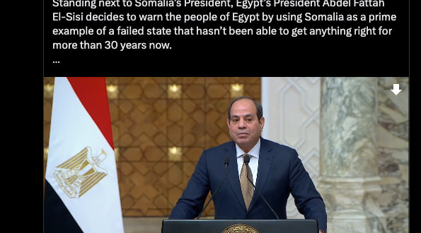 وكتب Ezzeldeen Devidar @ezzeldendevidar أن السيسي “حوّل المؤتمر الصحفي إلى رسالة داخلية”، معتبرًا أن الإشارة إلى الصومال كدولة فاشلة أمام رئيسها “تجاوز دبلوماسي”، رغم أن جوهر رأيه ركّز على “النبرة الفوقية” تجاه دولة عربية شقيقة.