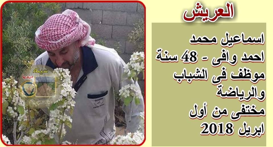 قالت صفحة “سيناء ميديا”، إن إسماعيل محمد أحمد وافي، 48 عامًا، تم إخفاؤه قسريًّا منذ نحو 9 أشهر. و”وافي” من أبناء مدينة العريش، ويعمل موظفًا بالشباب والرياضة، وقام ...