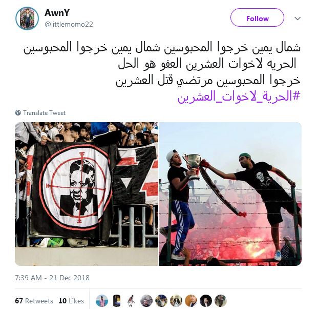أطلق جمهور الزمالك (الثالثة يمين) وهي المدرجات التي تضم الجماهير المساندة للفريق، هاشتاج “الحرية لاخوات العشرين” ليتصدر المركز الرابع على “تويتر” في فترة قصيرة ويرشحه المغردون ليتصدر المركز ...