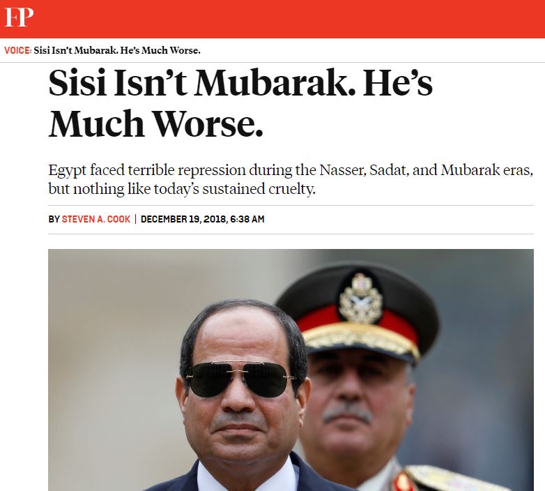 أكدت صحيفة فورين بوليسي أن مصر واجهت قمعا فظيعا خلال فترة حكم جمال عبد الناصر والسادات ومبارك، لكن لا شيء يشبه قسوة السيسي المتواصلة، وفي مقال لستيفن كوك ...