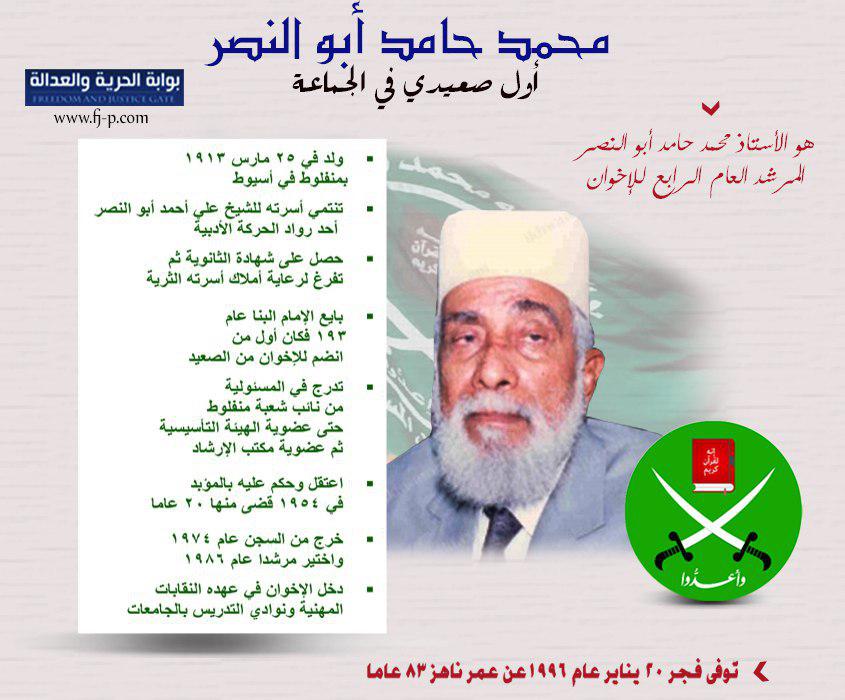 هو الأستاذ محمد حامد أبو النصر المرشد العام الرابع للإخوان ولد في 25 مارس 1913 بمنفلوط في أسيوط تنتمي أسرته للشيخ علي أحمد أبو النصر أحد رواد الحركة ...