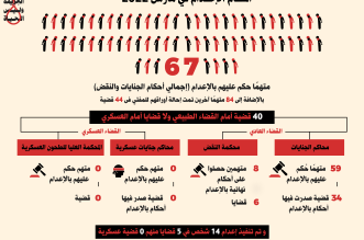 رصدت المبادرة المصرية للحقوق الشخصية صدور أحكام بإعدام 67 مواطنا خلال شهر مارس الماضي في 40 قضية نُفذ منها إعدام 14 مواطنا في 5 قضايا ، فضلا عن إحالة أوراق 84 آخرين للمفتي لأخذ الرأي في إعدامهم ...