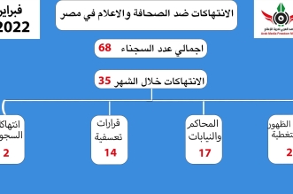 رصد المركز العربي لحرية الإعلام في تقريره عن انتهاكات حرية الإعلام في مصر خلال شهر فبراير 2022 المنفضي 35 انتهاكا متنوعا ، واستمرار حبس 68 صحفيا وصحفية. وذكر أنه جاء على رأس ...