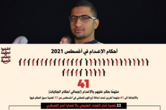 رصدت المبادرة المصرية للحقوق الشخصية صدور أحكام بالإعدام لـ41 مواطنا خلال شهر أغسطس المنقضي في 22 قضية تم نظرها أمام محكمة الجنايات. كما رصدت “تحويل أوراق 41 مواطنا لمفتي الجمهورية في 17 ...