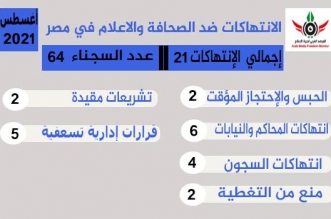 رصد تقرير انتهاكات حرية الصحافة في مصر لشهر أغسطس المنقضي الصادر عن المرصد العربي لحرية الإعلام 21 انتهاكا متنوعا. وجاء في المرتبة الأولى من حيث العدد، انتهاكات المحاكم والنيابات بـ(6) ...