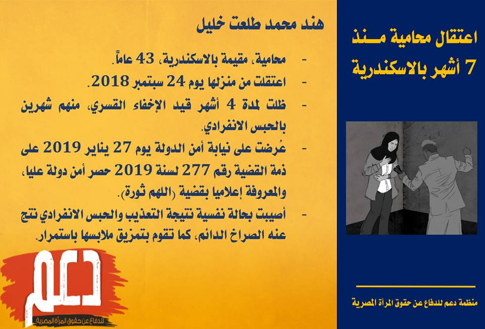 وثقت منظمة دعم للدفاع عن حقوق المرأة المصرية ما يحدث من انتهاكات بحق المحامية “هند محمد طلعت خليل” منذ أن تم اعتقالها من قبل قوات الانقلاب العسكرى بالإسكندرية ...