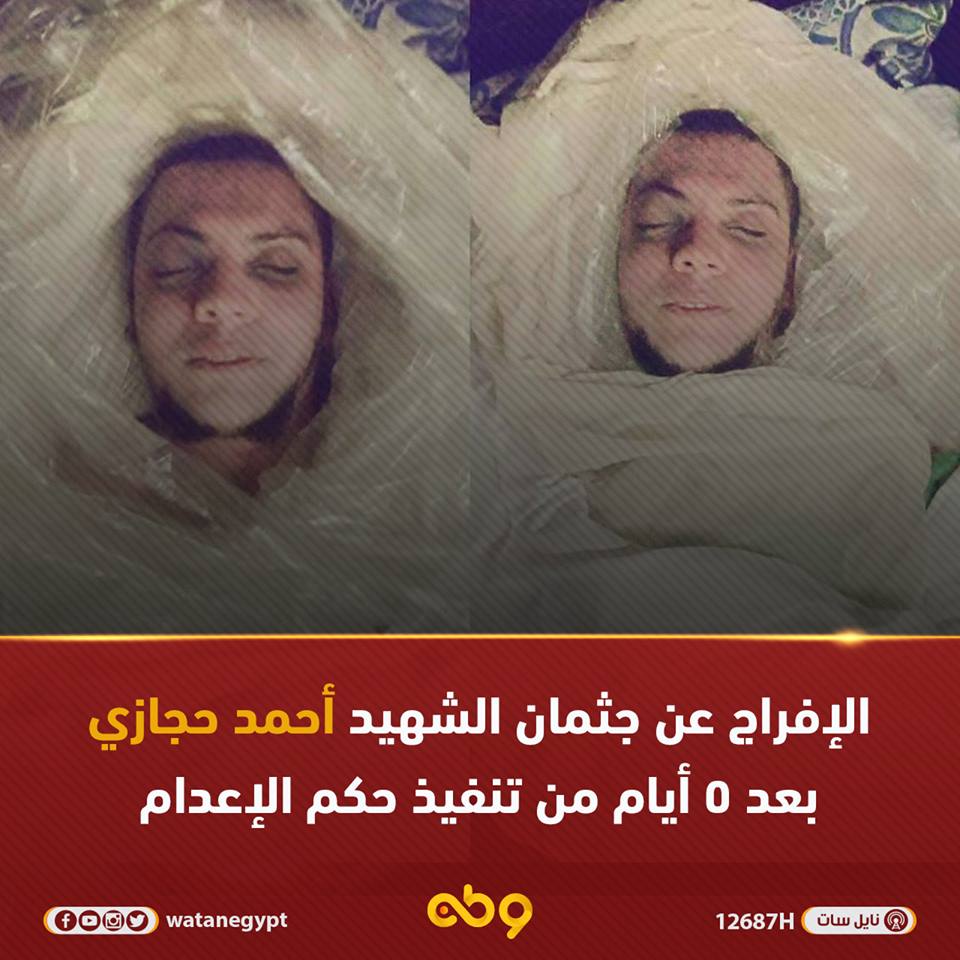 تسلّمت أسرة الشهيد أحمد حجازي جثمانه بعد تعنت داخلية الانقلاب في تسليم الجثمان لأسرته منذ 5 أيام، عقب تنفيذ حكم الإعدام عليه ظلمًا في قضية “النائب العام”. واشترطت ...