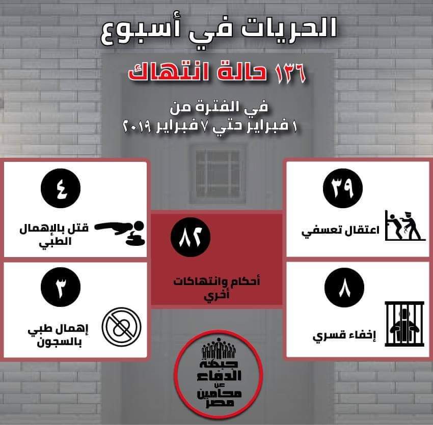 رصدت «شبكة المدافعين عن حقوق الإنسان» خلال الأسبوع الماضي، منذ يوم 1 فبراير حتى 7 فبراير 2019، نحو 136 انتهاكًا لحقوق الإنسان في مصر. وقالت الشبكة- عبر صفحتها ...