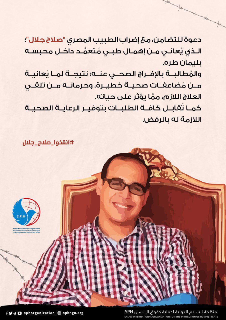 طالبت منظمة السلام الدولية لحماية حقوق الانسان، سلطات الانقلاب بالافراج فورا عن الطبيب صلاح جلال ، المعتقل داخل سجن ليمان طره، مشيرة الي تعرضة لاهمال طبي متعمد داخل ...