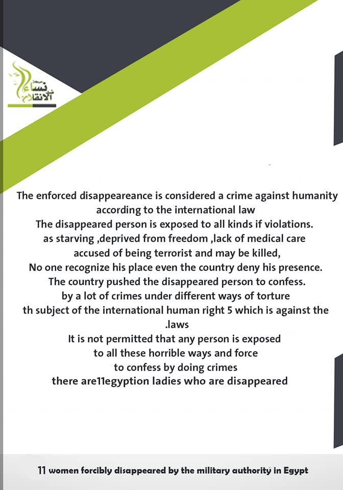 ناشدت حركة “نساء ضد الانقلاب” جميع المنظمات الحقوقية المعنية بأمن وسلامة الأفراد، سرعة التدخل للكشف عن مصير 11 من السيدات والفتيات تخفيهم قوات الانقلاب في مصر، ومقاضاة كل ...