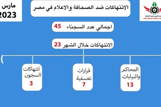 رصد المرصد العربي لحرية الإعلام (اكشف ) خلال تقريره عن انتهاكات حرية الإعلام في مصر لشهر مارس 2023 المنصرم 23 انتهاكا مع استمرار حبس 45 صحفيا وصحفية، ...