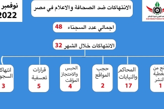 رصد المرصد العربي لحرية الإعلام 32 انتهاكا في تقريره عن انتهاكات حرية الإعلام في مصر لشهر نوفمبر المنصرم 2022 واستمرار حبس 48 صحفيا وصحفية بعد ضم 3 جدد لقافلة ...