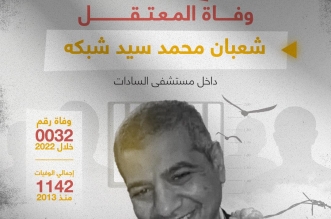 استشهد المعتقل شعبان محمد سيد شبكه، مدرس يبلغ من العمر 56 عاما، من محافظة المنيا، داخل مستشفى السادات الذي نقل إليه قبل يومين بعد تدهور حالته الصحية بشكل ...