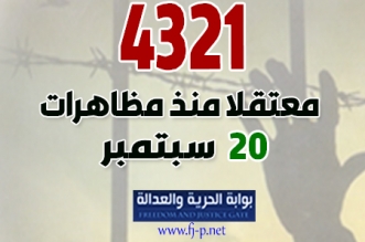 كشفت منظمات حقوقية عن وصول عدد المعتقلين على خلفية مظاهرات 20 سبتمبر، المطالِبة بإسقاط قائد الانقلاب العسكري عبدالفتاح السيسي وعصابته، إلى 4321 معتقلا، مشيرين إلى أن من بين ...