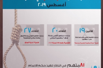 أصدر مركز عدالة للحقوق والحريات تقريرًا، رصد فيه إحصائيات أحكام الإعدام في مصر خلال شهر أغسطس المنصرم، والتي بلغت 13 حكمًا فى 3 قضايا هزلية. ونشر المركز غير ...