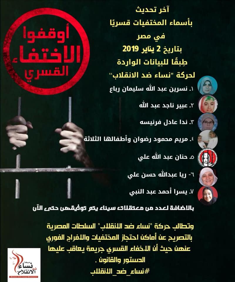 تواصل قوات أمن الانقلاب إخفاء 7 سيدات وفتيات قسريًّا، منذ اختطافهن لمدد متفاوتة دون سند من القانون، وترفض إجلاء مصيرهن، ولا تستجيب لأى مناشدات أو مطالبات تطلقها جهات ...
