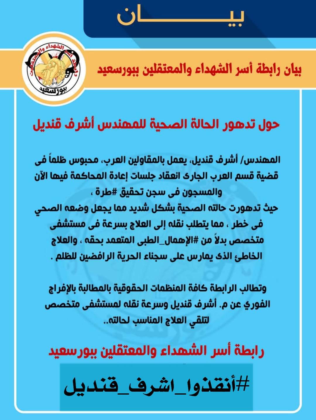 طالبت “رابطة أسر الشهداء والمعتقلين ببورسعيد” بالإفراج الصحي عن المهندس أشرف قنديل، بعد تدهور حالته الصحية وتعرض حياته للخطر في سجن تحقيق طره. وناشدت الرابطة- في بيان لها ...