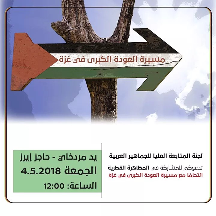 دعت لجنة المتابعة العليا، اليوم الأربعاء، أهالي الداخل المحتل، للمشاركة في المظاهرة التي ستنطلق الجمعة المقبلة قرب حدود شمال قطاع غزة. وأوضحت اللجنة في دعوتها إلى أن المسيرة ...