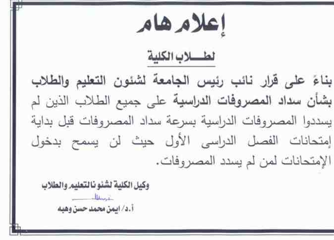 أثار قرار جامعة عين شمس، بمنع الطلاب غير المسددين للمصروفات الدراسية، من دخول الامتحانات، "الميد تيرم"، حالة من الغضب بين الطلاب. وحسب إعلان الجامعة : « بناء على ...