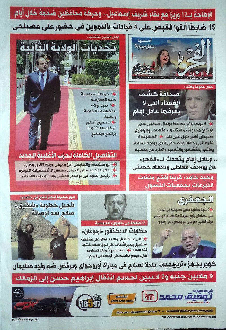 تصدرت تصريحات عبدالفتاح السيسي قائد الانقلاب مانشيتات وعناوين صحف الإثنين، وكان أبرزها تمسحه باللاعب الخلوق محمد صلاح نجم نادي ليفربول الإنجليزي الذي أصيب في نهائي دوري أبطال أوروبا ...