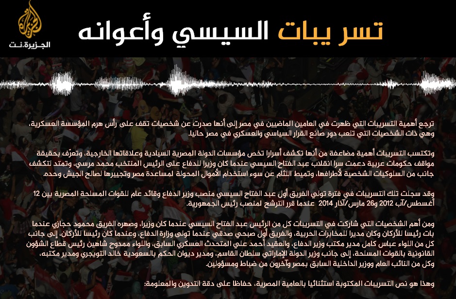 24 تسجيلًا مسربًا طال قائد الانقلاب العسكري عبد الفتاح السيسي، كشفت كرهه للإسلاميين وإعداده للانقلاب العسكري على الرئيس المنتخب، وطمعه في أموال الخليج، وترجع أهمية التسريبات التي ظهرت ...