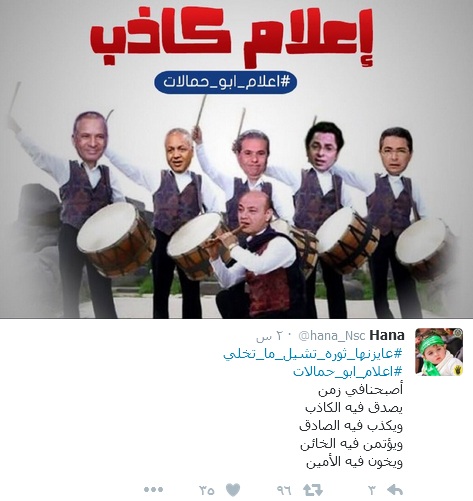 وكتب شاعر الثورة: "أول متشيل الإعلام لأنهم كلاب النظام باعوا للشعب الأوهام وعايشوا الناس فالأحلام قاطعوهم دول لئام".