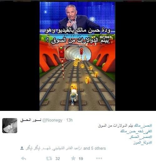 تفجرت طاقات السخرية على مواقع التواصل الاجتماعي على وقع هاشتاج #في_شقة_حسن_مالك الذي احتل صدارة «التريندات» بعد دقائق قليلة من إلقاء القبض على رجل الأعمال حسن مالك، والتى طفحت معها مجاري الأذرع الإعلامية لتجد حلول كافة مشاكل مِصْر في منزل القيادى الإخواني والعثور على مبررات لفشل السيسي وحكوماته داخل دولاب صاحب مباردة «ابدأ».