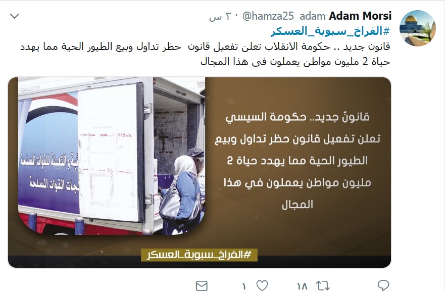 واعتبر صاحب الحساب Adam Morsi على “تويتر” أن القرار هدفه:”إجبار المصريين على شراء دواجن الجيش .. تفعيل قانون حظر نقل الدواجن”.