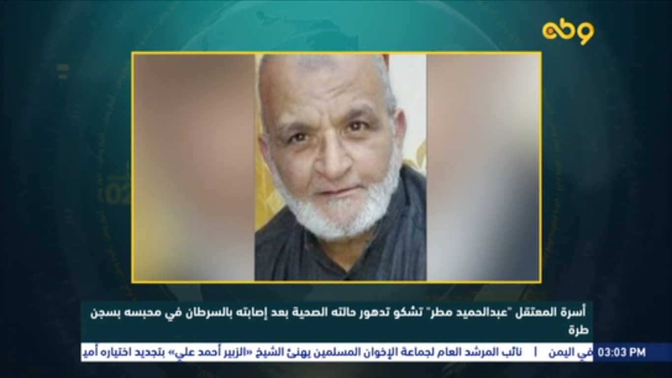 هذا وتشكو أسرة المعتقل عبد الحميد مطر من تدهور حالته الصحية في محبسه بسجن طره. وأوضحت الأسرة أن إدارة السجن تمنع دخول الأدوية عنه بعد إصابته بسرطان الكبد داخل محبسه، مؤكدة أنه بحاجة إلى العلاج الكيماوي وللمتابعة الطبية المستمرة داخل المستشفى.