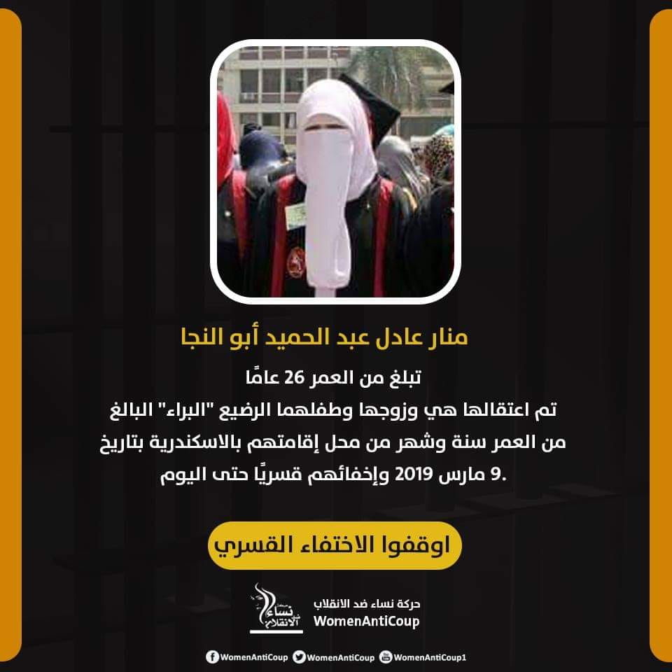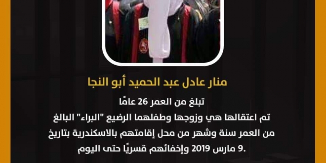 وذكرت الحركة- عبر صفحتها على فيس بوك- أن مليشيات العسكر تواصل الإخفاء القسري للحرة “منار عادل عبد الحميد أبو النجا”، تبلغ من العمر 26 عامًا، منذ اعتقالها هي وزوجها وطفلهما الرضيع “البراء”، البالغ من العمر سنة، من محل إقامتهم بالإسكندرية بتاريخ 9 مارس 2019.