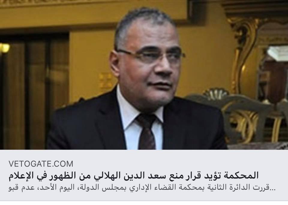 أيدت محكمة القضاء الإداري قرار منع سعد الدين الهلالي أحد أبرز شيوخ الانقلاب والأستاذ بجامعة الأزهر من الظهور في الإعلام إلا بموافقة من رئيس جامعة الأزهر، رغم أنه لم ينقطع يوما عن الظهور باعتباره ذراعا مزدوجا في الإعلام يفتي ويطبل ويدعي ويتأول.