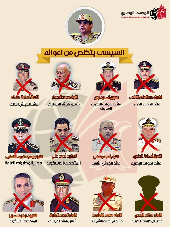 وقال الباحث العسكري محمود جمال: إن السيسي أقال 28 قائدا عسكريا ولم يبق إلا على 6 شخصيات حتى قبل عام انخفضوا إلى اثنين فقط ثم لم يعد منهم واحد من المجلس القديم، بعدما كان لصدقي صبحي الحق بإعطاء أوامر بتحريك القوات، ولقائد القوات الجوية يونس المصري.
