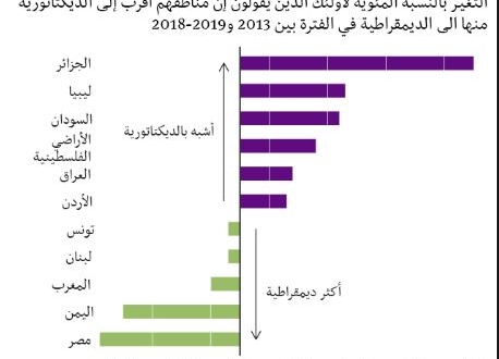 كان البارومتر العربي قد توصل في عام 2013 إلى أن سكان الجزائر والأردن والعراق هم الأكثر ترجيحًا لاعتبار بلدانهم أقرب إلى الديمقراطية من الديكتاتورية.