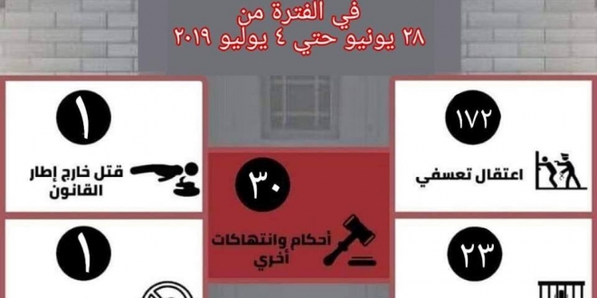 وذكرت، عبر صفحتها على “فيس بوك”، أنها رصدت خلال الشهر الماضي منذ يوم 28 مايو حتى 27 يونيو 2019، نحو 589 انتهاكًا لحقوق الإنسان في مصر، تنوعت بين 266 حالة اعتقال تعسفي، و53 حالة إخفاء قسري، و25 حالة قتل خارج إطار القانون، و6 حالات من الإهمال الطبي بالسجون، و239 حالة محاكمات وانتهاكات أخرى.