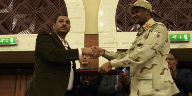 وقع المجلس العسكري في السودان وقوى الحرية والتغيير على وثيقة الاتفاق السياسي بشأن ترتيبات وهياكل الحكم خلال الفترة الانتقالية والمحددة بثلاث سنوات.