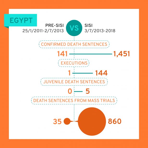رغم أن مركز "دفتر أحوال" أكد استخدام سلطات الانقلاب في مصر لعقوبة الإعدام بين 25 يناير 2011 و23 سبتمبر 2018. وتوصل إلى أنه حتى خلال هذه الفترة وحتى الآن وصلت أعداد عقوبة الإعدام الأولية إلى 2595 معتقلا، بينها 1592 حكمًا مؤكدًا بالإعدام، ونُفذ حتى هذا التاريخ 145 حكمًا بالإعدام، بينها 11 عقوبة إعدام أولية للأطفال،