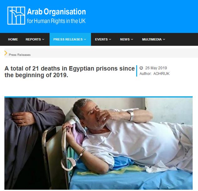 بعدما وصل عدد الوفيات بسجون الانقلاب، منذ بداية 2019، إلى نحو 21 حالة وفاة، ونحو 763 حالة وفاة في مراكز الاحتجاز منذ 3/7/2013، بينها 552 نتيجة للإهمال الطبي، اعتبرت المنظمة العربية لحقوق الإنسان في المملكة المتحدة، في بيان أخير لها، أن السجون المصرية أصبحت بمثابة فرق الموت، مما أدى إلى مقتل معتقليها بحرمانهم من حقهم في الحصول على الرعاية الطبية وتوفير بيئة خصبة لانتشار الأمراض والأوبئة؛ بسبب نقص النظافة ونشر التلوث والاكتظاظ وعدم عزل السجناء المرضى عن بقية السجناء.